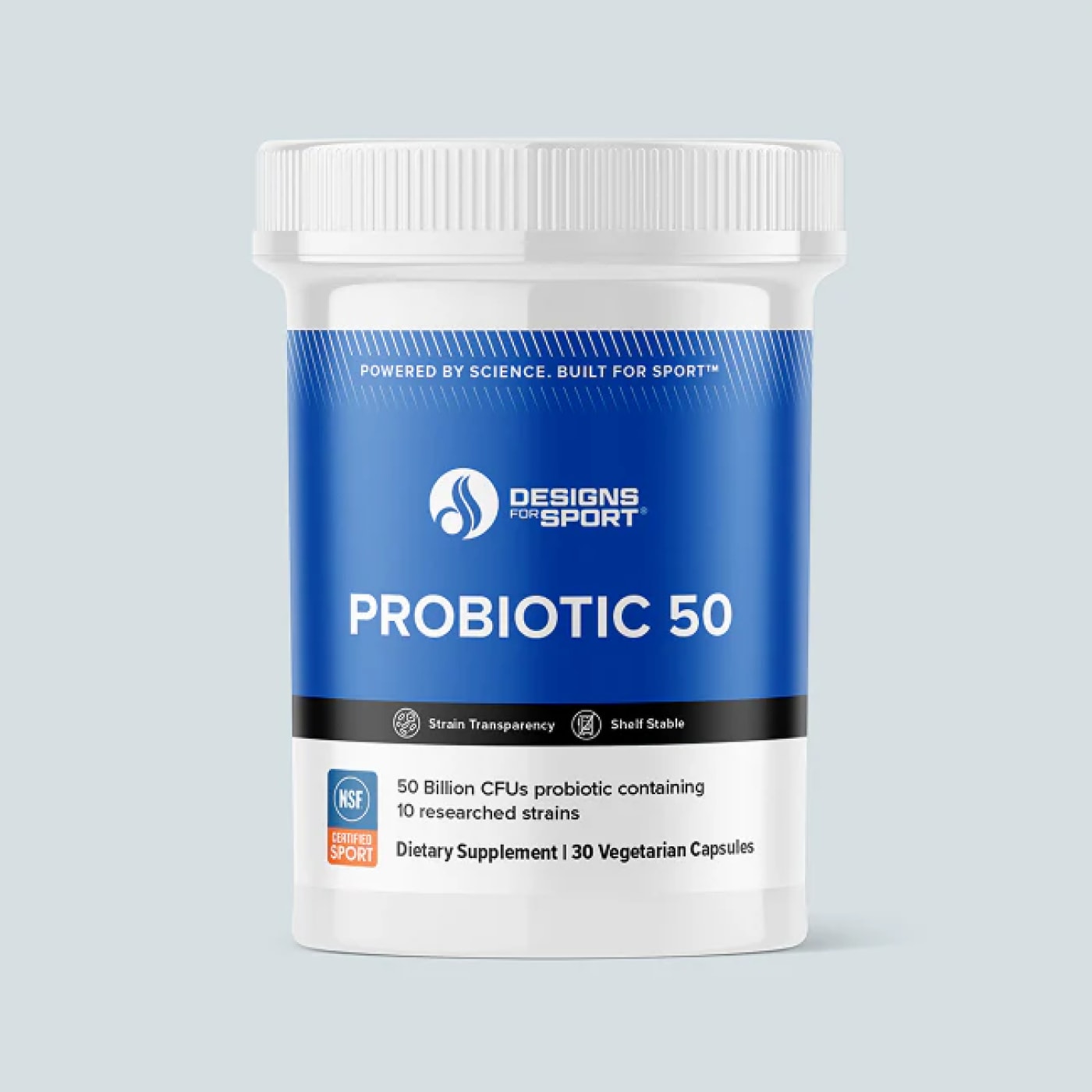 The 10 strains in Probiotic 50 are specifically selected for athletic applications—supporting recovery, reducing inflammation markers, and improving nutrient absorption. It's NSF Certified for Sport, shelf-stable, and uses delayed-release technology so bacteria survive stomach acid.