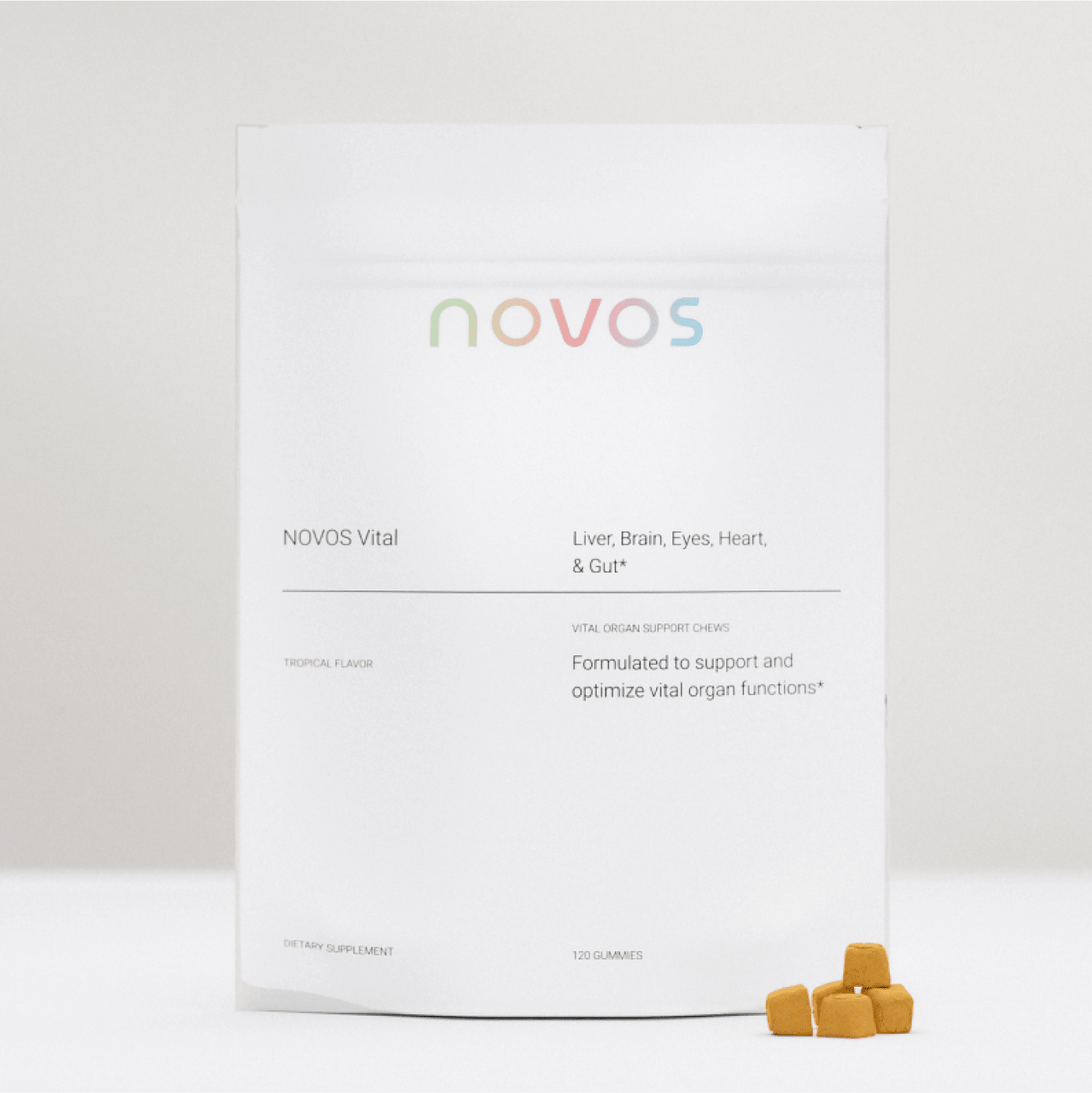 Your organs work overtime during training. NOVOS Vital delivers nattokinase for cardiovascular function, trehalose for cognitive support and lutein/zeaxanthin for vision health. Seven ingredients. Four tropical chews. Zero compromise on what matters long-term. This delivers the support you need to be built to last.